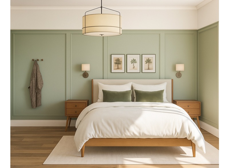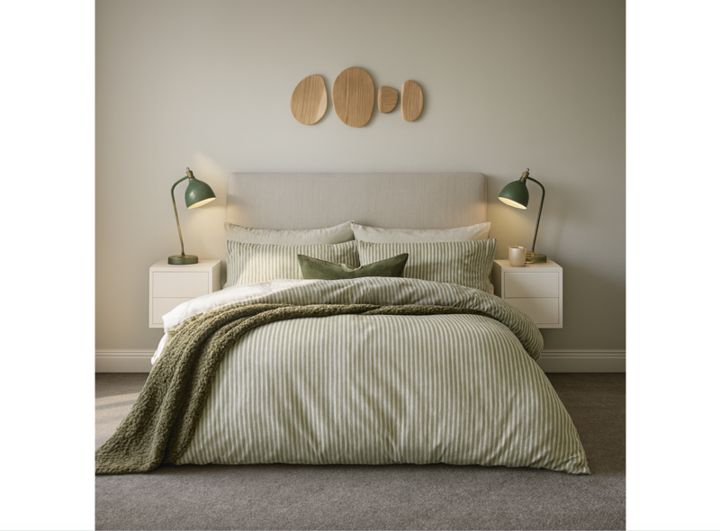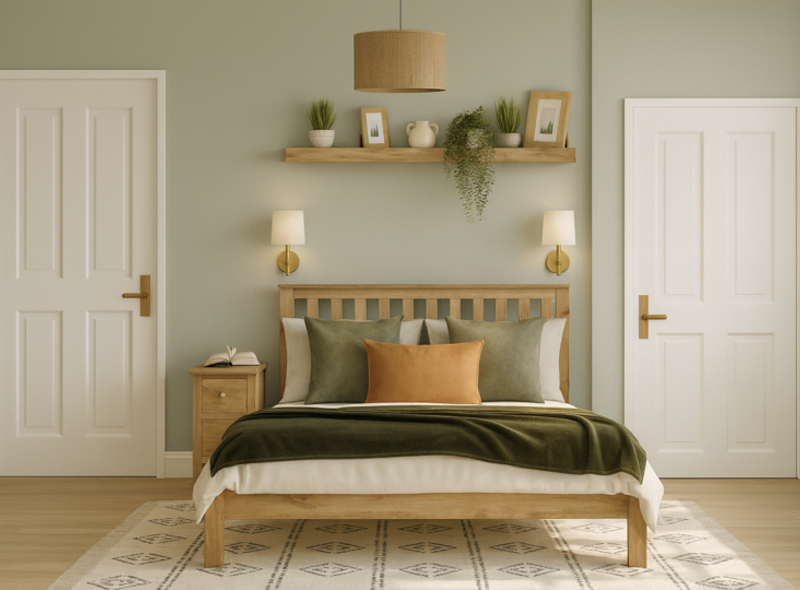 If you’d like to go for a bolder colour scheme in your bedroom design then look to muted, softer hues that have warmer undertones like sage or moss green or a dusky pink.