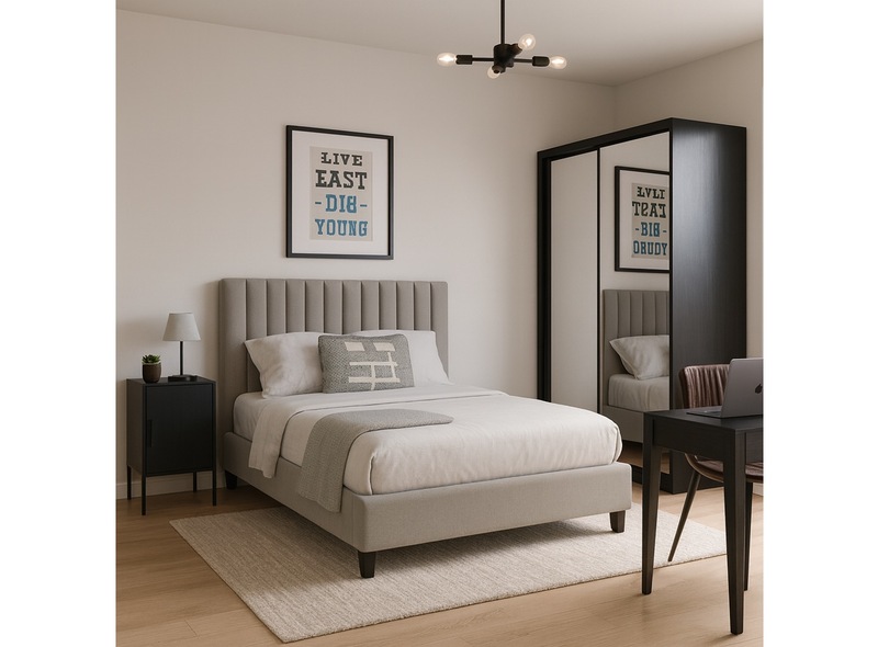 1. Start with the bed - the biggest piece of furniture. Go for the biggest size you can afford in terms of space and also budget.