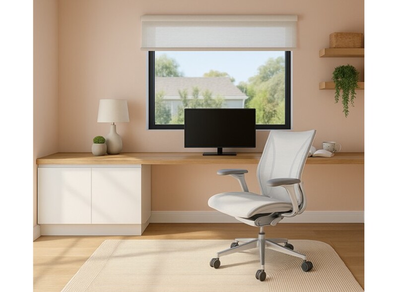 Firstly, think about how you work in the space. Are you mostly at your desk? Do you need to be able to get up and down a lot? Maybe you have the habit of putting your feet on the desk when taking calls? Prioritize your comfort by allowing yourself space and make sure to invest in a decent desk chair that allows you to be as comfortable as possible while working at your desk.