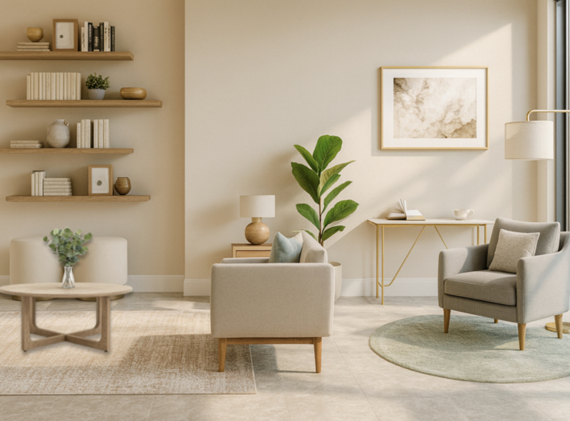Choose soft neutrals that have undertones in your favourite colours whether that’s lilac, blue, yellow etc. You can then draw out that colour throughout the room with your cushions, rugs and curtains.