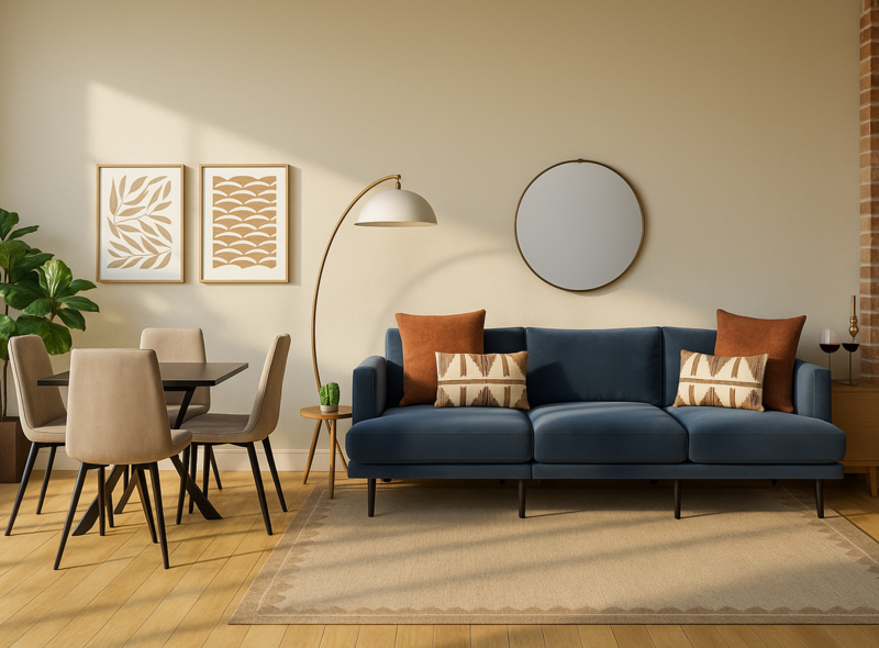 You’ll also need to use the unique shape and size available to you as a guide for the layout. Perhaps you have an L-shaped open plan layout? This might seem like a disadvantage but in fact it makes creating distinction between the spaces much easier.