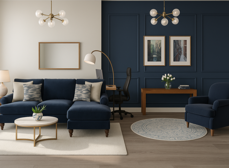 Remember there’s no need to paint the whole room in the same colour. In fact, paint is another great way to create distinctions between the zones. For example you can choose a dark blue on a feature wall behind your sofa to make it clear this is a space for settling down and relaxing.