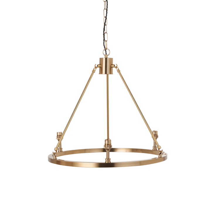 The timeless simplicity of a hoop design finished in aged brass plate with authentic brass B22 lamp holders makes the Chester the perfect addition to your home. With height adjustable chain and twisted fabric flex. This is a fitting only pendant, complete the look with 3 of our 16cm decorative fabric shades for a timeless chandelier to be proud of. Material: Metal Product Zone: Indoor Bulb Included: No Bulb Quantity: 3 Bulb Type: B22 Golf Cable Length: 1000mm Dimmable: Dimmable Voltage: 220-240V Class: Class 1 IP Rating: 20 Additional Information: Adjustable Drop 600-1500mm