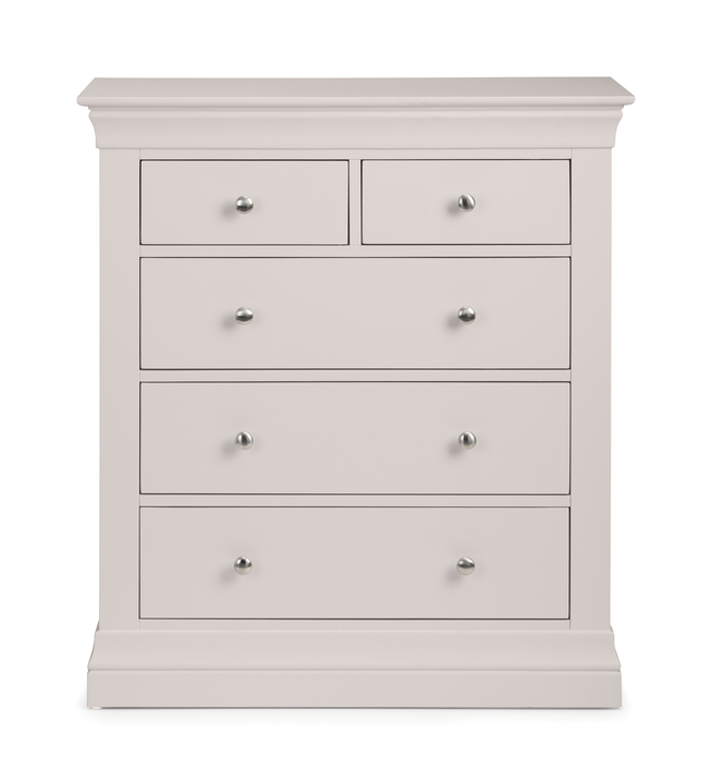 Materials: MDF {• |||product feature 1}• Elegant French design, suitable for both contemporary or traditional décor.. • Crafted from Pine and MDF with brushed steel handles.. • H100.5 x W90 x D45cm, Weight 37.0kg • x1 Chest of Drawers/Dresser • DIMENSIONS: Height 100.5 x Width 90 x Depth 45cm, Net Weight 37.0kg • WHAT'S INCLUDED: You will receive x1 Chest of Drawers/Dresser No Assembly Needed. Level of Assembly Required: No Assembly Needed Build Time: 0.0 $ Total Net Weight: 37.0 Cleaning Instructions: Wipe Clean with Dry Cloth