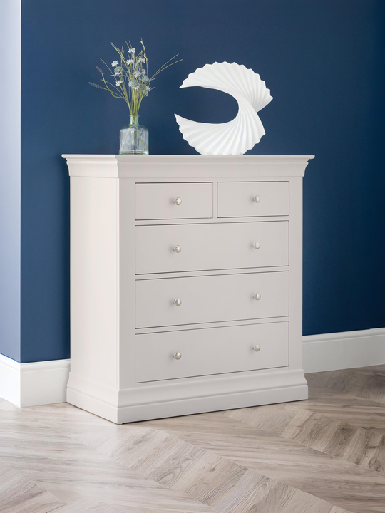 Materials: MDF {• |||product feature 1}• Elegant French design, suitable for both contemporary or traditional décor.. • Crafted from Pine and MDF with brushed steel handles.. • Featuring 2 small and 3 large drawers, suitable for your T-shirts, underwear and other items.. • Part of the Julian Bowen Clermont Bedroom Collection. Level of Assembly Required: No Assembly Needed Build Time: 0 $ Total Net Weight: 37 Cleaning Instructions: Wipe Clean with Dry Cloth