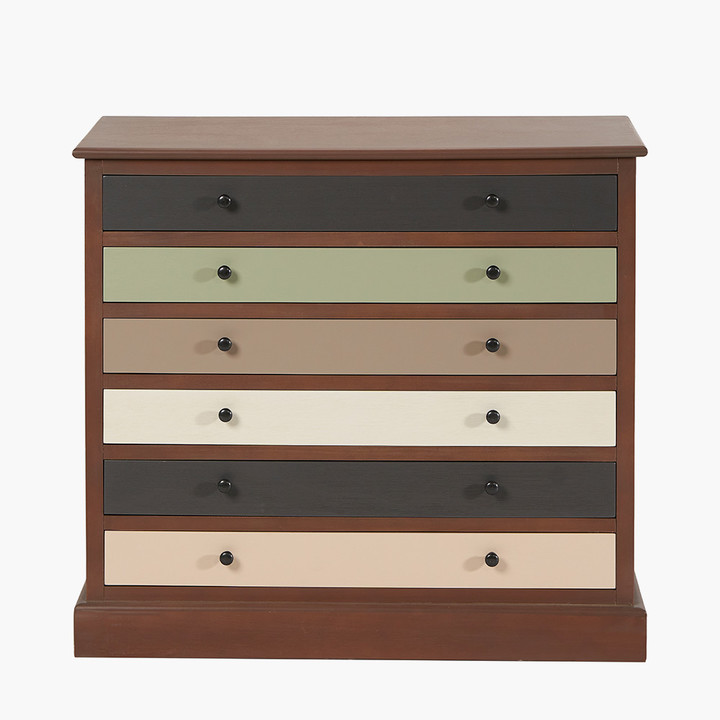 With 6 slim but generously proportioned drawers, this industrial style drawer unit is not only stylish but also practical. The grey, sage and cream coloured drawers are a softer take on reclamation and industrial trends. Pair with other pieces from the Loft sage range to complete the look. Brochure Box Type: Standard Brochure Description: Sage Multicoloured Pine Wood 6 Drawer Unit Brochure Name: Loft CBM: 0.25700000000000001 Country of origin: China Drawer: Yes Drawer dimensions 1: 70 x 22 x 7 Drawer dimensions 10: n/a Drawer dimensions 11: n/a Drawer dimensions 12: n/a Drawer dimensions 2: n/a Drawer dimensions 3: n/a Drawer dimensions 4: n/a Drawer dimensions 5: n/a Drawer dimensions 6: n/a Drawer dimensions 7: n/a Drawer dimensions 8: n/a Drawer dimensions 9: n/a Furniture warning label: Yes Handle: Yes Mail order packaging: 2 Master code: 76-523 Material 1: Wood Material 2: n/a Material composition (%): Pine wood 90%, MDF 10% Number of drawers: 6 Number of handles: 12 Number of product boxes: 1 Number of shelfs: 0 Outer box depth (front to back): n/a Outer box height (top to bottom): n/a Outer box quantity: n/a Outer box weight: n/a Outer box width (side to side): n/a Packaging status: 3 Polybag warning label: No Product status: 3 Product weight: 19 Shelf: No Shelf dimensions 1: n/a Shelf dimensions 2: n/a Single product depth (front to back): 32 Single product height (top to bottom): 72 Single product width (side to side): 80 Spec sheet: Chest of Drawers User guide included: No Variant position: 1 Wall strap included: Yes Colour 1: Multi Colour 2: Green