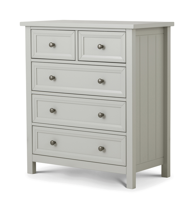 Materials: MDF {• |||product feature 1}• Dove grey lacquered finish. • Attractive pewter handles. • H94 x W84 x D44cm, Weight 32.9kg • x1 Chest of Drawers/Dresser • DIMENSIONS: Height 94 x Width 84 x Depth 44cm, Net Weight 32.9kg • WHAT'S INCLUDED: You will receive x1 Chest of Drawers/Dresser Full Assembly Required. Level of Assembly Required: Full Assembly Required Build Time: 45.0 $ Total Net Weight: 32.9 Cleaning Instructions: Wipe Clean with Dry Cloth Foot/Leg Height: 8.0