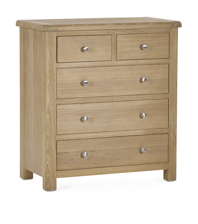 Materials: Oak {• |||product feature 1}• Smooth curved edging • Two small and three wide pull-out drawers • 2 handle options to choose from, both included in your purchase. • Part of Julian Bowen’s Memphis bedroom range Level of Assembly Required: No Assembly Needed Build Time: 0 $ Total Net Weight: 32 Cleaning Instructions: Wipe Clean with Dry Cloth