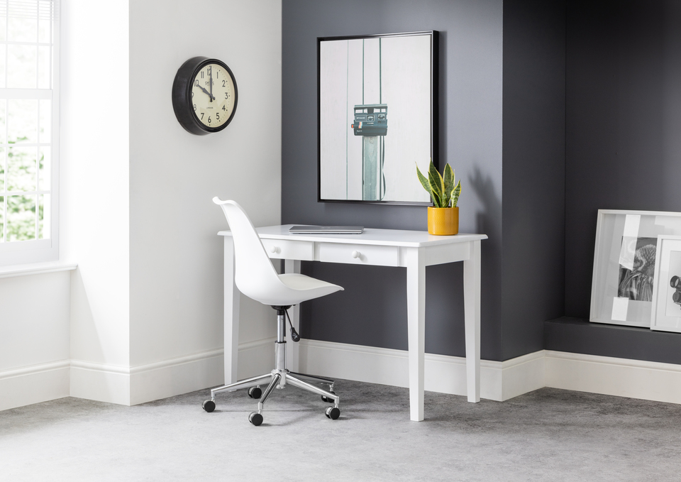 • Elegant Design: The Carrington Desk features a sleek white finish and clean lines, perfect for contemporary home offices and study areas. Ample Workspace: Provides a spacious tabletop for working, studying, or crafting. Sturdy Construction: Made from high-quality materials for durability and stability. Easy to Clean: The smooth surface is easy to maintain and keep looking new. Versatile Use: Suitable for home offices, bedrooms, and living spaces.