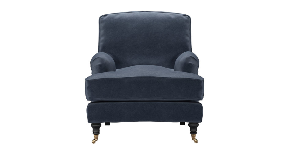 A classic design and one of our most popular sofas. back cushions: feather and fibre color: Blue, Grey covers: fixed seat cushions: feather wrapped foam size: Armchair