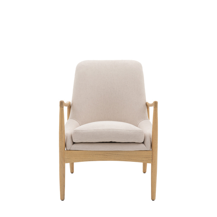 Offering an contemporary twist on mid-Century style, this beautiful chair will suit a wide range of interiors. The oak frame with its natural weathered finish is perfectly complementd by the natural linen coloured fabric. The padded back and seat cushion adds extra comfort to the chair. Material: Solid Oak / Plywood / Polyester / Foam / Polyfibre Product Zone: Indoor Seat Height: 460mm Seat Width between arms: 420mm Seat Depth: 510mm Leg Finish: Weathered Clearance to Floor: 460mm Assembly Required: No Anti Topple Kit: No