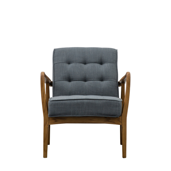 Mid century stand out personality piece with a solid oak angled frame twinned with soft dark grey linen upholstery and decorative deep pull detailing. Material: Oak / Linen Seat Height: 450mm