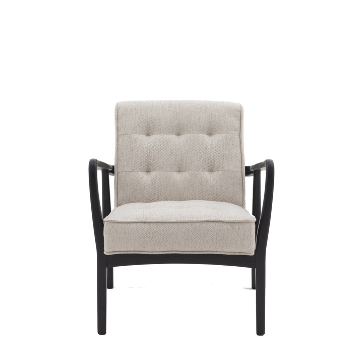 Stand out Mid-Century style with a dramatic black solid oak angled frame and contrasting natural weave upholstery. The deep pull detail and smooth lines create a comfortable feature chair, suited to vintage and modern style homes alike. Material: Oak / Plywood / Polyester / Foam / Polyfibre Product Zone: Indoor Seat Height: 450mm Seat Width between arms: 520mm Seat Depth: 500mm Leg Finish: Black Clearance to Floor: 450mm Assembly Required: No Anti Topple Kit: No