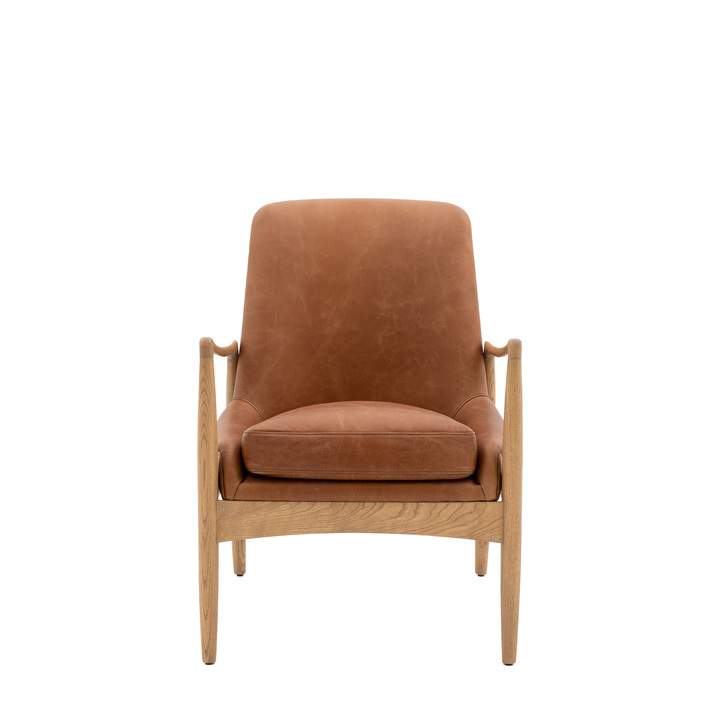 Offering an contemporary twist on mid-Century style, this beautiful chair will suit a wide range of interiors. The oak frame with its natural weathered finish is perfectly complementd by the brown leather. The padded back and seat cushion adds extra comfort to the chair. Material: Oak / Plywood /Leather/ Foam / Polyfibre Product Zone: Indoor Seat Height: 460mm Seat Width between arms: 420mm Seat Depth: 510mm Leg Finish: Weathered Clearance to Floor: 460mm Assembly Required: No Anti Topple Kit: No