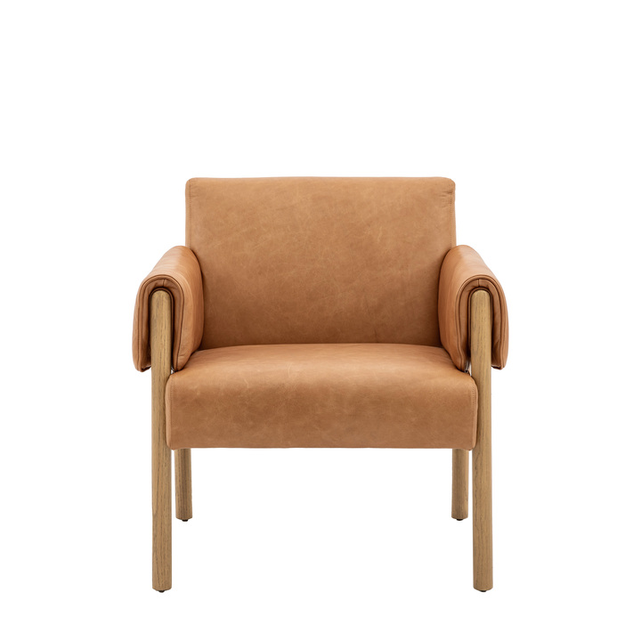 This stunning contemporary armchair is upholstered in lovely brown leather which pairs beautifully with the wooden arms and legs. Adding an unusual, stylish design detail, the wooden arms are wrapped in leather upholstery, adding comfort and style. A matching sofa is available. Material: Solid Oak / Plywood / Leather / Foam / PolyPolyfibre Seat Height: 480mm Seat Width between arms: 535mm Seat Depth: 500mm Leg / Feet Height: 300mm Clearance to Floor: 300mm
