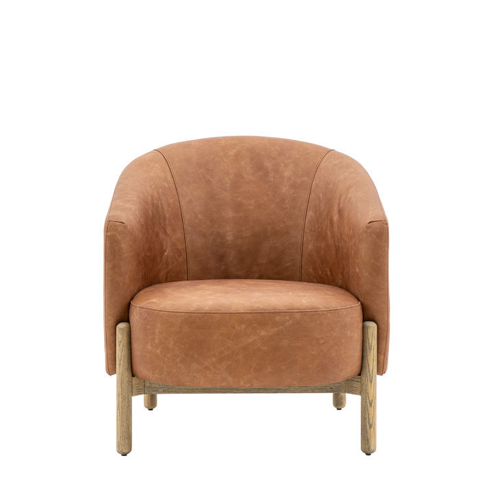 This stunning armchair would look at home in a wide range of interiors. The deep seat and beautifully curved back are upholstered in an vintage-style brown leather which pairs perfectly with the stunning wooden frame and legs. Also available in a lovely natural coloured fabric and matching footstools are available. Material: Solid Oak / Plywood / Leather / Foam / PolyPolyfibre Seat Height: 440mm Seat Width between arms: 530mm Seat Depth: 520mm Leg / Feet Height: 190mm Clearance to Floor: 190mm