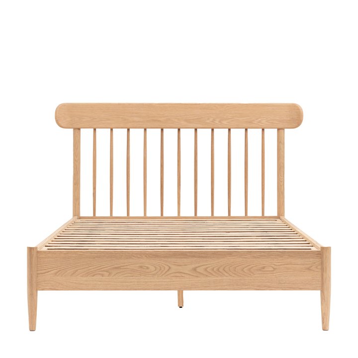 This charming bed features a classic spindle design that adds a touch of elegance to any bedroom. Its solid oak frame is both durable and aesthetically pleasing. The natural finish complements a variety of interior styles. Material: Oak Veneer / MDF / Oak / Rubber Wood Product Zone: Indoor Leg Material: Oak Veneer Clearance to Floor: 180mm Assembly Required: Yes - Full Assembly Footboard Height: 400mm Under Bed Storage Height: 180mm