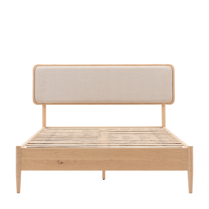 This bed is a comfortable and stylish addition to any bedroom. Its oak frame is both durable and aesthetically pleasing, with a contemporary neutral fabric that compliments the clean design. The natural finish complements a variety of interior styles. Material: Oak Veneer / MDF / Oak / Rubber Wood / Fabric Product Zone: Indoor Leg Material: Oak Veneer Clearance to Floor: 180mm Assembly Required: Yes - Full Assembly Footboard Height: 400mm Under Bed Storage Height: 180mm