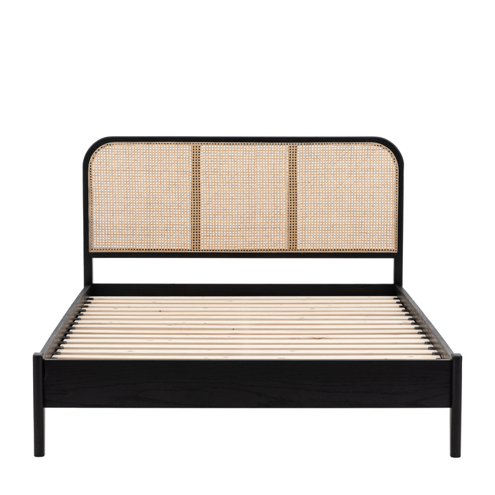 Dramatic statement style sure to become a modern classic. The solid black stand oak frame combines comfort and style ease, with curved corner headboard featuring a woven rattan panel creating a stunning stand out contrast of colours and materials. Available in 4'6" and 5" sizes. Material: Oak / Oak Veneer / Pine / Rattan Product Zone: Indoor Leg Finish: Matte Painted Clearance to Floor: 170mm Assembly Required: Yes Anti Topple Kit: No Footboard Height: 385mm Under Bed Storage Height: 170mm