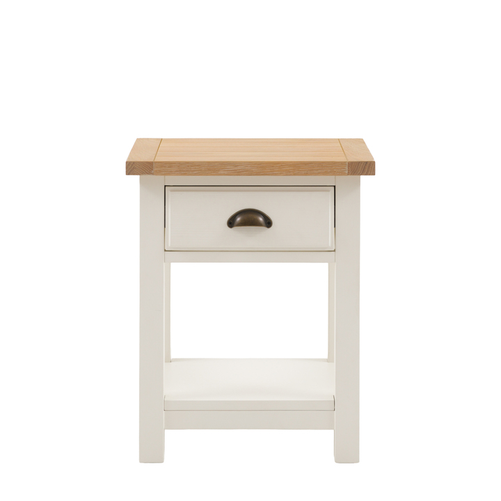 Add traditional charm to a bedroom with this slim bedside table. With a single drawer and lower shelf, the compact design offers plenty of storage space. The soft white painted finish complements the grooved natural top and metal handle detail. Due to the handmade nature of this product, colour variations may be present. Material: MDF / Pine / Oak Veneer / Plywood / Rubber Wood Leg / Feet Height: 47mm Clearance to Floor: 47mm Storage: 1 Drawer / 1 Shelf Internal Drawer Size: W260 x D276 x H84mm Adjustable Shelves: No Distance between shelves: 270mm
