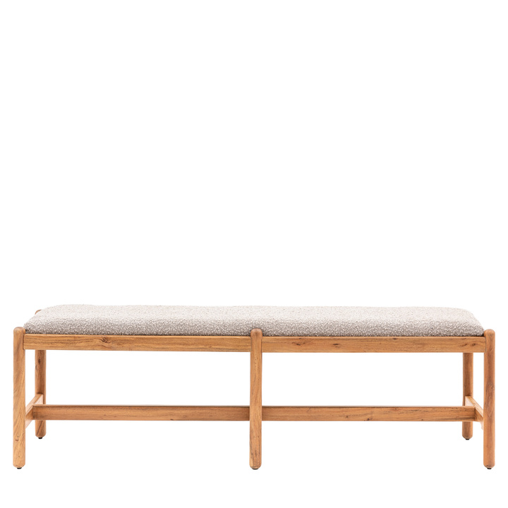 The perfect complement to our coordinating dining table this dining bench's retro influence is clear. Giving a modern twist to the vintage inspired design the rich Acacia wood bench is upholstered in tactile grey Boucel fabric. Coordinating pieces also available. Material: Acacia / Fabric / Foam Seat Height: 460mm Seat Width between arms: 1600mm Seat Depth: 400mm Seats - Table / Bench: 3 Leg / Feet Height: 100mm Clearance to Floor: 100mm
