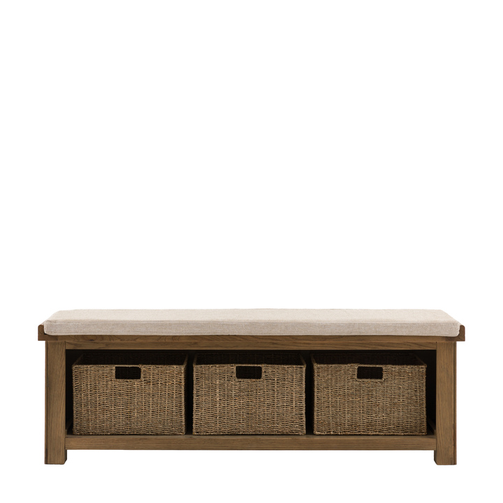 Discover the perfect blend of seating and storage with this charming hall bench. Ideal for living rooms, mudrooms or hallways, this bench offers a comfortable spot to sit and kick off your shoes, while its three natural wicker baskets keep clutter out of sight. The oak solid & veneer finish is full of rich grain detail with a warm finish, perfectly complementing the natural tone of the padded seat, creating a relaxed and inviting addition to your space.