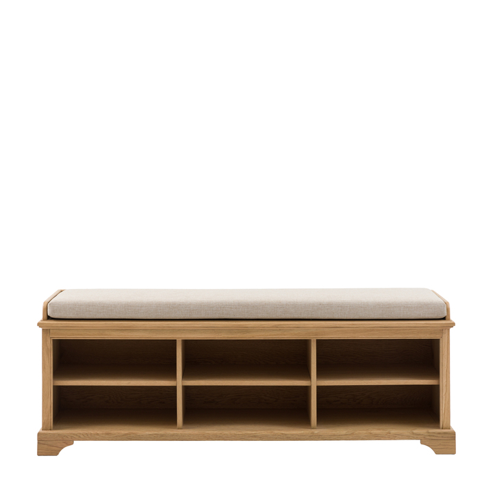 Welcome functionality and style into your home with this versatile hall bench. Perfect for your entryway, the bench features a comfy, natural toned upholstered cushion for seating and six open cubbies, ideal for organising shoes, bags, or other essentials. The wooden frame is crafted in solid oak & veneers, full of subtle grain detail and natural warmth, adding a touch of natural charm to any space. Material: Oak / Rubberwood / Oak Veneer / MDF / Fabric Product Zone: Indoor Seat Height: 600mm Seat Width between arms: 1340mm Seat Depth: 340mm Seats - Table / Bench: 2 Leg / Feet Height: 50mm Clearance to Floor: 50mm Assembly Required: No