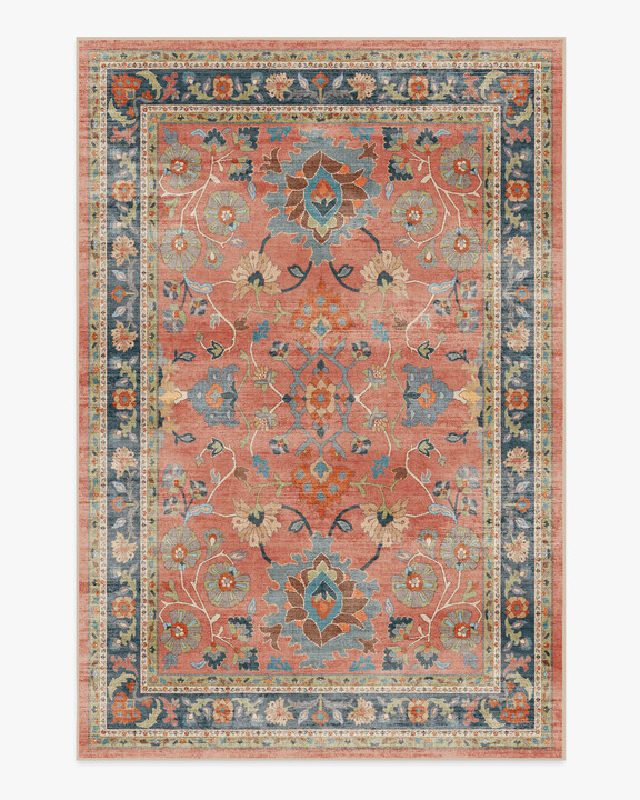 Inspired by vintage Persian designs, our Calabria Coral Multicolour Rug features organic floral and foliage motifs arranged with distressing and needlepoint textures to give a vintage, coastal feel. Its palette includes citron, neutrals, blues, yellows, reds, and pinks, all set against a coral background with a navy border. Water-resistant, stain-resistant, and machine-washable. Rug colours may vary slightly according to your device and the lighting in your space. 200 x 290 cm | Machine Washable Area Rug | Kid & Pet Friendly | Indoor Rugs | Calabria Coral Rug | Ruggable