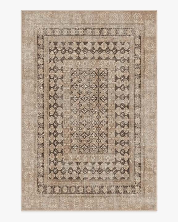 From our Founder's home to yours. Inspired by European café napkins, our Cyrus Rose Gold Rug imparts a distressed feel that unlocks world culture and artisanal craftsmanship. Its neutral beige background, tinted with a hint of pink, gives off a luxurious rose gold feel. The design is complemented by a slightly lighter rose gold, creating a subtle yet shiny halo outline on some of the motifs, and adding depth within the composition. The final touch is a deep, rich brown, reminiscent of intricate tile work. Water-resistant, stain-resistant, and machine-washable. Rug colours may vary slightly according to your device and the lighting in your space. 200 x 290 cm | Machine Washable Area Rug | Kid & Pet Friendly | Indoor Rugs | Cyrus Rose Gold Rug | Ruggable