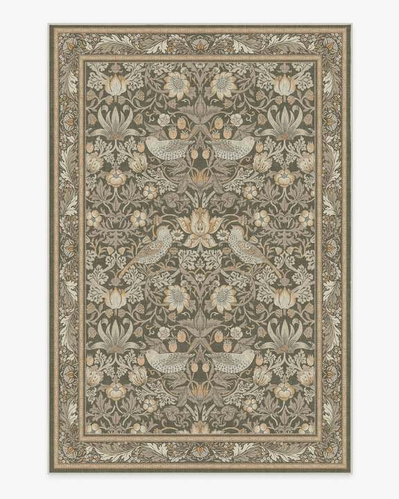 Step into Kelmscott Manor's garden with the Morris & Co. Strawberry Thief Indigo Rug. A direct translation of William Morris's recognisable block print textile, this rug depicts Morris's thrushes stealing fruit from his kitchen garden. This exclusive colourway layers warm taupe and ivory with neutral grey and beige for subtle sophistication. Water-resistant, stain-resistant, and machine-washable. Rug colours may vary slightly according to your device and the lighting in your space. 200 x 290 cm | Machine Washable Area Rug | Kid & Pet Friendly | Indoor Rugs | Strawberry Thief Stone Gold Flatwoven Rug by Morris & Co. | Ruggable
