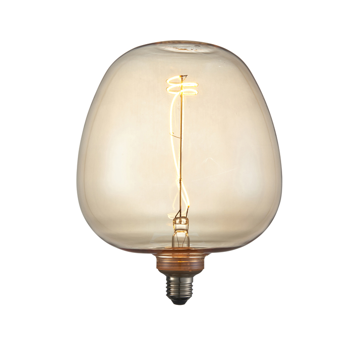 Decorative LED filament lamp in tinted amber glass with unique swirl. Create interest and personality to your home by placing this lamp in a table base or flex set. Can be displayed up or down, this would also make for a great gift. Material: Glass / Steel Product Zone: Indoor Bulb Included: Yes Bulb Type: E27 G125 Product Lumens: 80 Lumens Per Watt: 20 Kelvin: 1800 Dimmable: Non-Dimmable Voltage: 220-240V IP Rating: 20