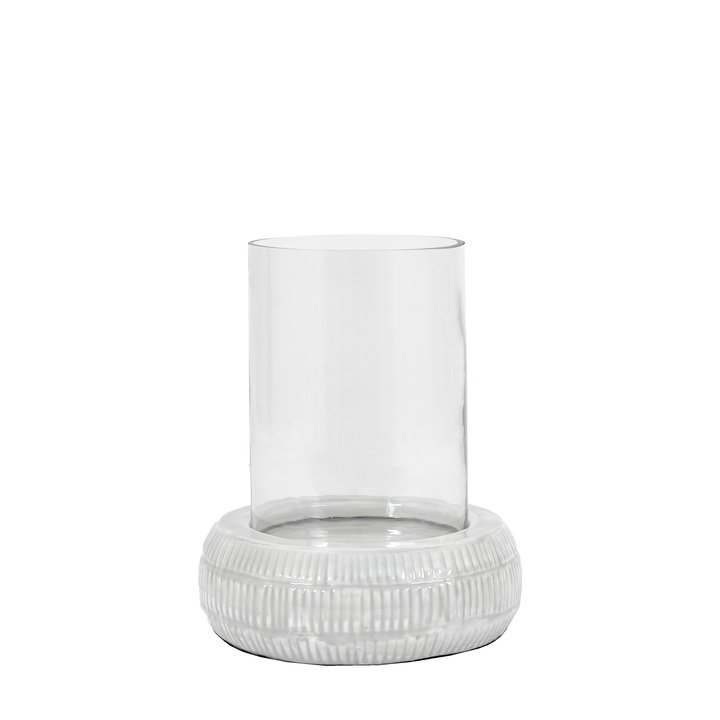 Featuring a rounded grey base with an intriguing textured pattern and simple glass lantern, this hurricane lamp is understatedly elegant. Pairs perfectly with the coordinating lantern in sage green. Candle not included. Material: Iron / Glass Product Zone: Indoor