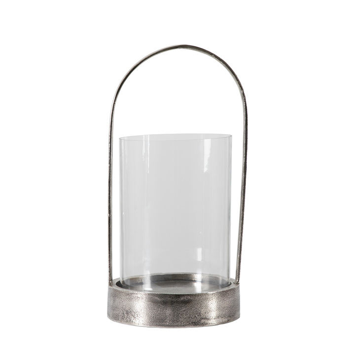 This unusual candle holder features an antique nickel effect metal framework and a glass cylinder to enclose the candles. Perfect for use throughout the year. Material: Aluminium / Glass Product Zone: Indoor