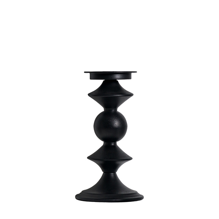 The classic shape of this candlestick in black metal feels like a fresh take on a classic design, updating a traditional turned style candlestick. Available in a matching larger size, the pair look fantastic grouped together. Candle not included. Material: Iron Product Zone: Indoor