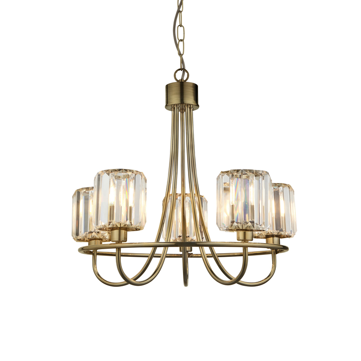 Sophisticated 5 light pendant with decorative clear cut faceted glass shades that beautifully disperse the light. Elegant arms in an antique brass plate finish; perfect for hanging in any living space. Other matching items available. Material: Steel / Glass Bulb Quantity: 5 Bulb Type: 6W LED E14 Product Lumens: 470 Lumens Per Watt: 78 Cable Length: 1500mm Dimmable: Yes Voltage: 220-240V Class: Class 1 IP Rating: 20 Additional Information: Adjustable Drop 620 - 2000mm