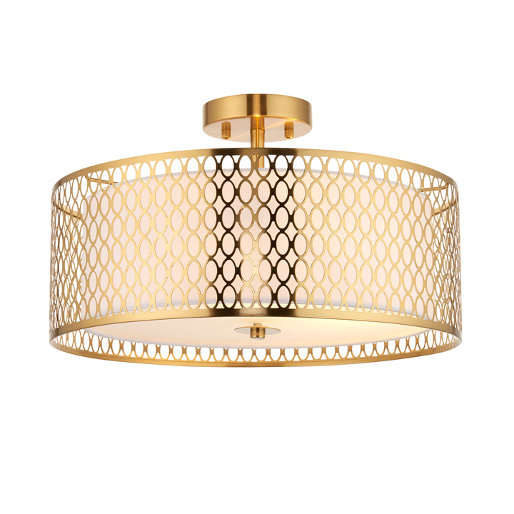 No compromise on design for low ceilings. This is a classic circular light with a trendy geometric fretwork metal outer and an inner fabric shade for lovely light diffusion. In a gold effect plate finish with frosted glass this light would compliment a range of interior style. This product is also dimmable to create a relaxing atmosphere. Material: Steel / Fabric Product Zone: Indoor Bulb Included: No Bulb Quantity: 1 Bulb Type: E27 or B22 GLS IP Rating: 20