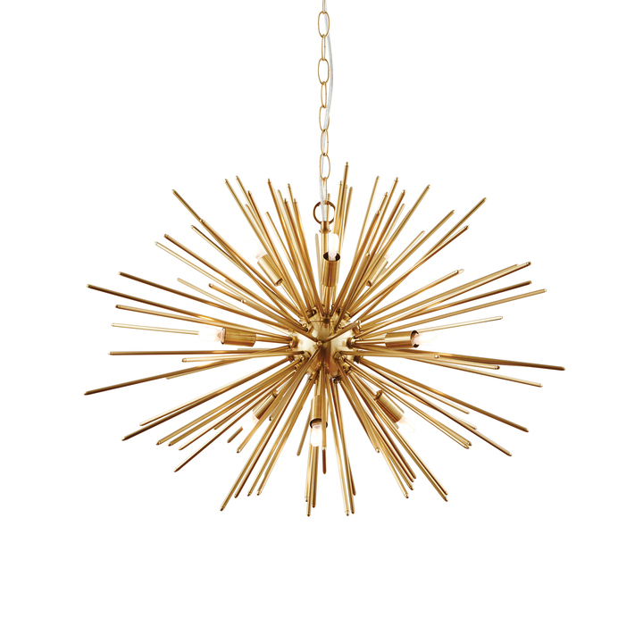 Following the 70’s trend this Sputnik style pendant light is finished in satin gold finish. 9 lights are scattered among the metal spikes creating a stunning centrepiece. This product is fully dimmable. Material: Steel Product Zone: Indoor Bulb Included: No Bulb Type: 9 x 25W G9 clear capsule Product Lumens: 370 Lumens Per Watt: 15 Kelvin: 2800 Cable Length: 1500mm Dimmable: Dimmable Voltage: 220-240V Class: Class 2 IP Rating: 20 Additional Information: H: 520-1900mm