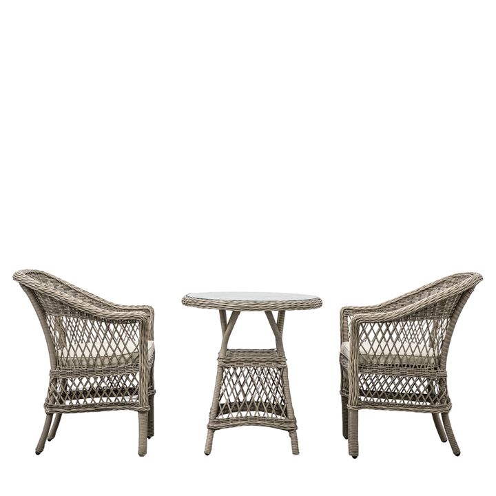 This lovely bistro set is crafted from all-weather 5mm PE rattan with a combination of close weave and open weave patterns to give a stylish design in a lovely stone colour. For comfort, the seats have luxurious showerproof cushions in a soft colour to complement the colour of the rattan. The frames are aluminium and the table top is glass. Coordinating items are available. Material: Aluminum / Poly Rattan / Polyester / Glass Product Zone: Outdoor Shape: Round Seats - Table / Bench: 2-3 Additional Information: Cushions are shower resistant only, not waterproof, and must not be left out in the rain or wet conditions, as this will cause damage and staining due to the fire-resistant treatment applied. Cushions should be stored away when not in use to keep the Set includes - OTDR: 2 x Chair: W610 x D640 x H880 mm / 1 x Bistro Table: W650 x D650 x H750 mm Seat Height - OTDR: 420mm Seat Width between arms - OTDR: 445mm Seat Depth - OTDR: 450 Seats - OTDR: 2 Leg / Feet Height - OTDR: 700mm Clearance to Floor - OTDR: 700mm Assembly Required - OTDR: Top Only