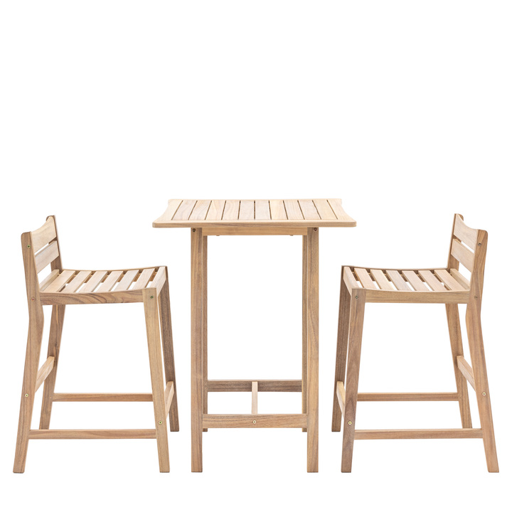 Enjoy an evening drink with this modern and chic bar set. Made from Acacia wood with an oiled finish the set comes complete with a slatted top table and 2 low back bar chairs, all at a slightly lower than normal height for a more relaxed feel. Material: Acacia Product Zone: Outdoor Additional Information: Clearance To Floor: Table: 850 / Chair: 600 Set includes - OTDR: 2 x Bar Stool: W450 x D550 x H850 mm / 1 x Bar Table: W700 x D700 x H900 mm Seat Height - OTDR: 640 Seat Width between arms - OTDR: 450 Seat Depth - OTDR: 400 Seats - OTDR: 2 Hanging Orientation - OTDR Mirror: Hanging and Stand Fixing Type - OTDR Mirrors: Decorative Metal Chain Assembly Required - OTDR: Yes