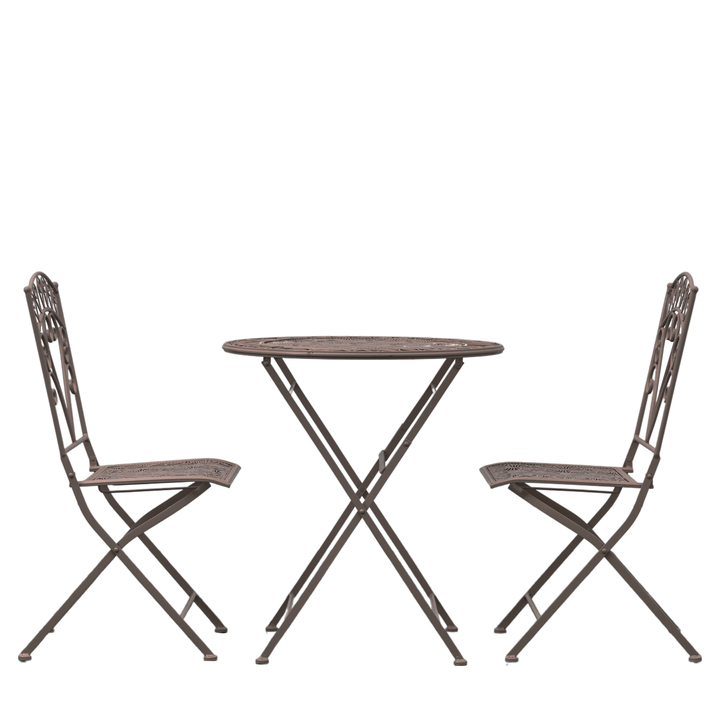 Ideal for balconies, smaller outdoor spaces and cosy garden corners, this lovely set offers a bistro café style. Crafted from metal in a lovely deep metal patina finish, the design is inspired by nature, with the pattern on the table top and chair seats evocative of leaves and trees. The table and chairs fold for easy storage when not in use. It is also available in an unusual pink finish. Material: Iron Product Zone: Outdoor Shape: Round Additional Information: Showerproof Set includes - OTDR: 2 x Folding Chair: W390 x D520 x H950 mm / 1 x Folding Bistro Table: W700 x D700 x H760 mm Seat Height - OTDR: 440mm Seat Width between arms - OTDR: 400mm Seat Depth - OTDR: 400 Seats - OTDR: 2 Leg / Feet Height - OTDR: 43mm Clearance to Floor - OTDR: 43mm Assembly Required - OTDR: No