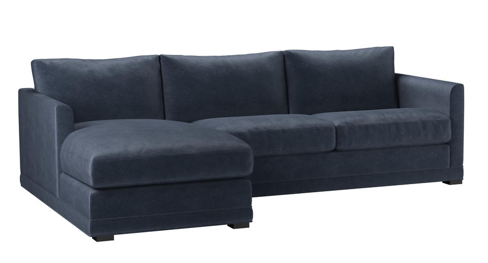 A sofa made for corners. back cushions: feather and fibre color: Blue, Grey covers: fixed seat cushions: feather wrapped foam size: Medium Left Hand Chaise