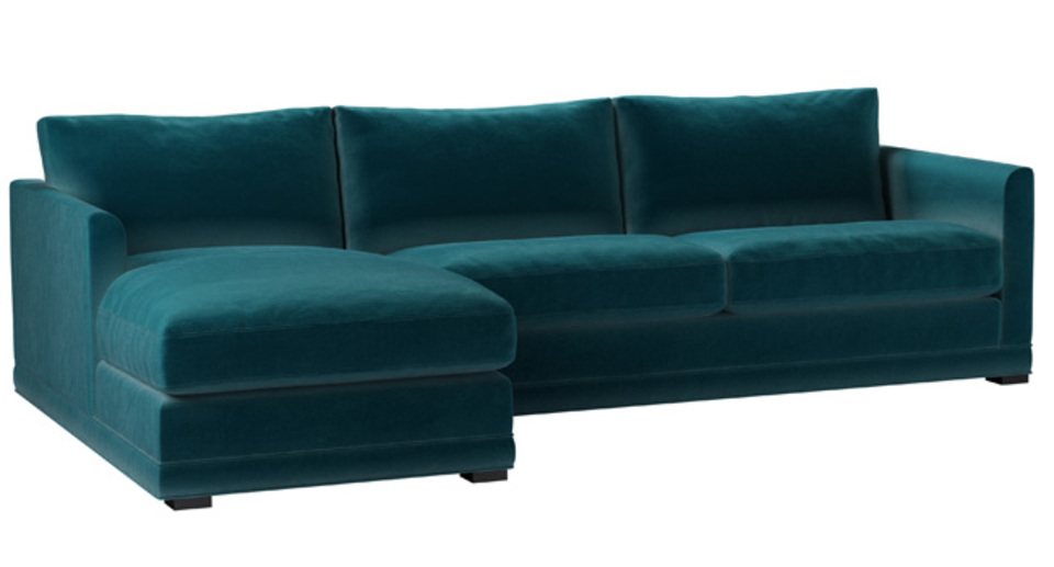A sofa made for corners. back cushions: feather and fibre color: green,blue covers: fixed seat cushions: feather wrapped foam size: Large Left Hand Chaise