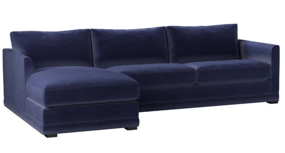 A sofa made for corners. back cushions: feather and fibre color: blue covers: fixed seat cushions: feather wrapped foam size: Large Left Hand Chaise