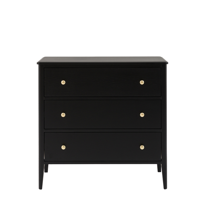 Organise any space with this elegant 3 drawer chest. Featuring three generous drawers, this chest offers ample storage while adding sophisticated style to a room. The rich black finish is beautifully complemented by gold handles, bringing a touch of modern luxe to a bedroom, dressing room, or living area. Material: MDF / Rubber Wood Product Zone: Indoor Clearance to Floor: 172mm Storage: 3 Drawers Internal Drawer Size: 760 x 430 x 194mm Anti Topple Kit: Yes