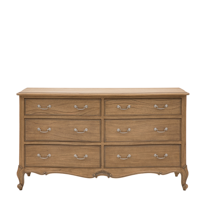 Heavily influenced by traditional French furniture designs, this beautiful chest of drawers exudes style and quality. The weathered finish shows the lovely grain of the Mindy ash with classy handles completing the look. Matching pieces available. Material: Mindi Ash / Veneered MDF Product Zone: Indoor Shape: Rectangle Leg / Feet Height: 110mm Clearance to Floor: 110mm Storage: 6 Drawers Internal Drawer Size: W625 x D360 x H120mm Anti Topple Kit: Yes