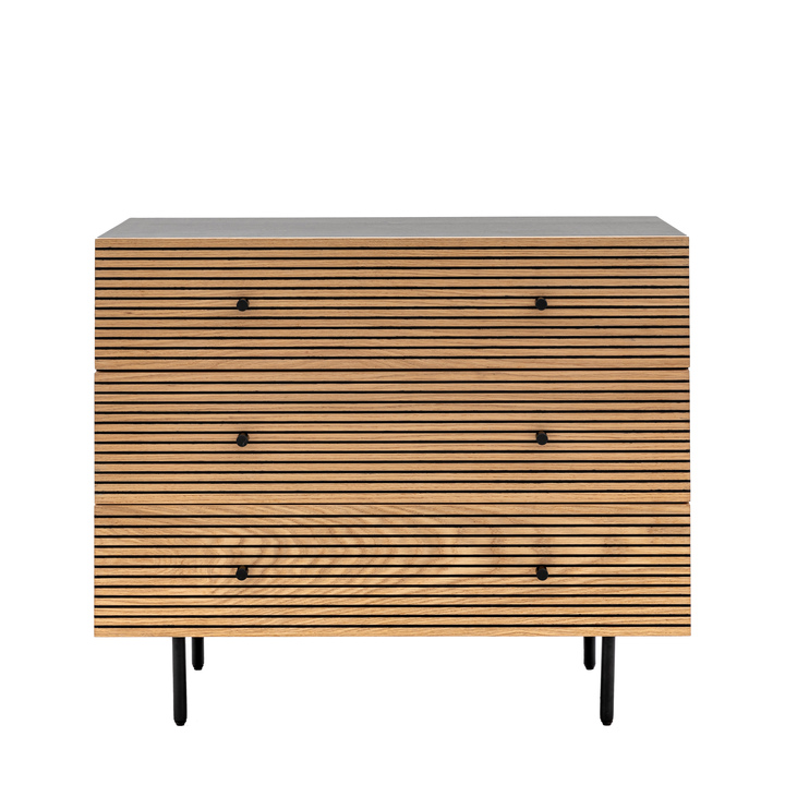 Add a contemporary look to a room with this stylish chest of drawers. The carcase has a black finish with a pressed woodgrain effect to create a premium look. The drawer fascias are real oak woodgrain veneer with a feature black line pattern. A black metal underframe and drawer handles complete the look. Matching items available Material: MDF Melamine / Oak Veneered MDF / Iron / MDF / Rubber Product Zone: Indoor Shape: Rectangle Leg / Feet Height: 150mm Clearance to Floor: 150mm Storage: 3 Drawers Internal Drawer Size: W868 x D360 x H158mm Assembly Required: Leg / Foot Only Anti Topple Kit: Yes