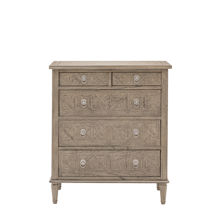 This collection is made from Mindy wood and lightly brushed to recreate the natural ageing of a beach side veranda, open to the elements of sun and sand. The design and finish has a nod towards French Colonial style but would equally suit a modern interior. Material: Mindy Ash Storage: 5 Drawers Internal Drawer Size: 338 x 329mm Internal Cupboard Size: 750 x 760mm Assembly Required: Yes