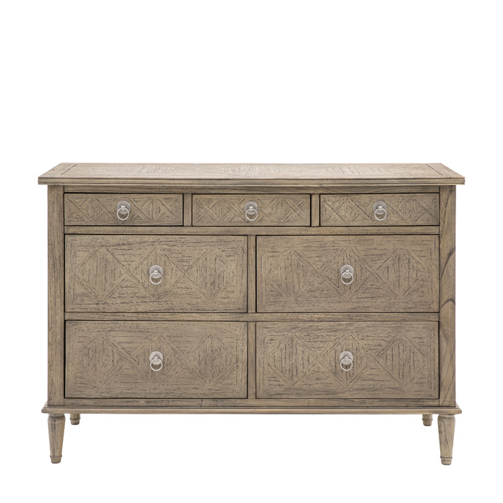 This collection is made from Mindy wood and lightly brushed to recreate the natural ageing of a beach side veranda, open to the elements of sun and sand. The design and finish has a nod towards French Colonial style but would equally suit a modern interior. Material: Mindy Ash Storage: 7 Drawers Internal Drawer Size: 3 Small drawers - 370x425x100, 4 Large drawers - 565x425x250 Assembly Required: Yes