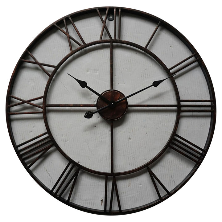 Masterfully crafted with an open skeleton design, this striking bronze wall clock brings sophisticated industrial charm to any space. The impressive 80cm diameter makes a bold statement, while the slender Roman numerals and delicate metalwork create an airy, architectural presence that doesn't overwhelm. The antique bronze finish offers timeless appeal, perfectly balancing vintage character with contemporary styling. Each graceful numeral is meticulously rendered in an elegant classical font, framed by a minimalist outer ring that appears to float against the wall. The sleek hour and minute hands complete the refined aesthetic while ensuring excellent visibility. This versatile timepiece pairs beautifully with both modern and traditional interiors. In contemporary spaces, it adds warmth and historical context alongside clean-lined furniture and monochromatic schemes. For classic rooms, it harmonizes naturally with antique woods, leather upholstery, and heritage prints. The clock makes a stunning focal point above fireplaces, in entrance halls, or as part of a carefully curated wall display. For styling inspiration, mount against exposed brick or industrial concrete walls, combine with vintage maps and architectural prints, or layer with mixed metallic accessories in brass and copper. The piece works wonderfully paired with deep jewel tones and rich textiles, creating sophisticated ambiance in library or study settings alongside leather-bound books. The open design allows wall colors and textures to show through, creating depth and visual interest while maintaining an uncluttered aesthetic. Built with quality materials and precise movement, this statement piece offers both beautiful form and reliable function. A timeless investment that will continue to command attention and spark conversation for years to come.