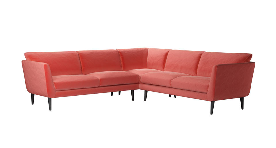 The Holly's retro-inspired shape and simple elegance is a nod to the sleek and curvy mid-century style. A neat frame - with high, splayed arms, a deep seat, and lots of comfy cushions - sits on tall tapered legs. This is one cool sofa. back cushions: 100% feather color: pink covers: fixed seat cushions: feather wrapped foam size: Medium Corner Sofa